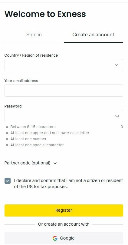 - Exness không chấp nhận công dân hoặc cư dân Hoa Kỳ đăng ký tài khoản