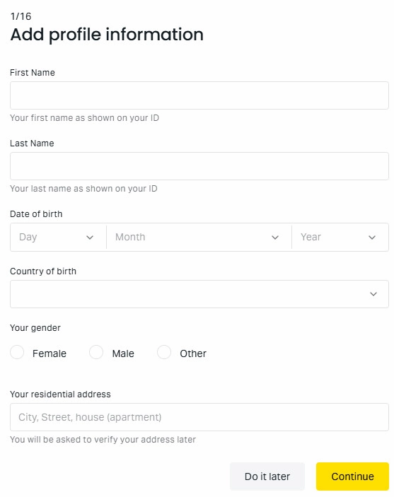 Điền họ tên, ngày tháng năm sinh, địa chỉ hiện tại và giới tính. Thông tin phải chính xác và trùng khớp với giấy tờ tùy thân bạn sẽ nộp khi xác minh KYC.